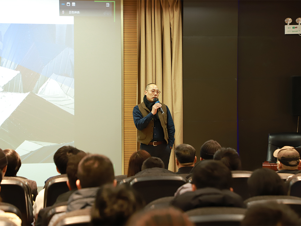 谭勋教授以《我的实践》为题,以个人创作经历和代表作品为线索,围绕“我的学院雕塑”、“我的当代雕塑创作实践”、“艺术与生活”三大板块,层层递进,深入浅出地讲述了自身从“关注材料与形式语言”的实验性创作到“突出对生命、存在等概念思考”的现实性创作,再到“以城市化发展为主题”的公共艺术创作变化的心路历程和经验总结。谭勋强调,艺术创作需要依赖经验,但更多的是基于对日常生活中的体验与反思,在艺术学习和创作过程中,要不断关注对社会、现实、生命以及生存的思考,辩证地理解“自然”与“人为”的关系,同时也要将社会的发展、城市的变迁融入到创作中来,这样作品才能凸显出艺术语言和身份价值。