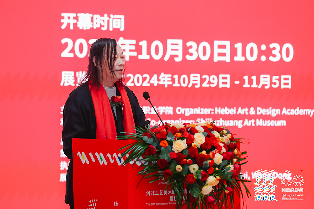 张广军致答谢辞。他指出,此次展览不仅是对学校六十年来辛勤耕耘与辉煌成果的回顾与致敬,更是对未来发展的展望与期许。六十年的光辉历程,既是河工美坚持与奉献的赞歌,又是河工美创新与发展的篇章,更是河工美人矢志不渝、追求卓越的生动写照。此次展览将激励更多师生继续在艺术与设计领域探索前行,为传承与发展工艺美术事业贡献自己的力量,同时也为文化创意产业发展注入新的活力与灵感,为河北工艺美术事业的研究、发展、创新、推广添砖加瓦。