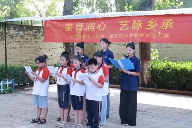 实践团队与孟家庄小学联合举办了“美育润心·艺脉乡承”主题文艺汇演。本次活动以艺术展演为载体,创新思政教育形式,通过我系学生与小学生同台演出、互动交流,打造了一堂生动活泼的思政实践课。汇演中集体朗诵《少年强则国强》将汇演推向高潮,得到200余名师生以及家长一致好评。活动尾声,时尚工艺系党总支副书记张玉英代表实践团队赠予孟家庄小学福字,愿这抹炽热的红,化作他们课桌上的晨曦,笔尖上的星光,照亮前方。本次汇演,实现了思政教育的入脑入心,小学生们在艺术熏陶中深化了爱国情怀,大学生们在指导排练中强化了使命意识,充分展现了新时代青年与少年儿童携手共进、同心筑梦的精神风貌,为乡村振兴注入了青春力量。